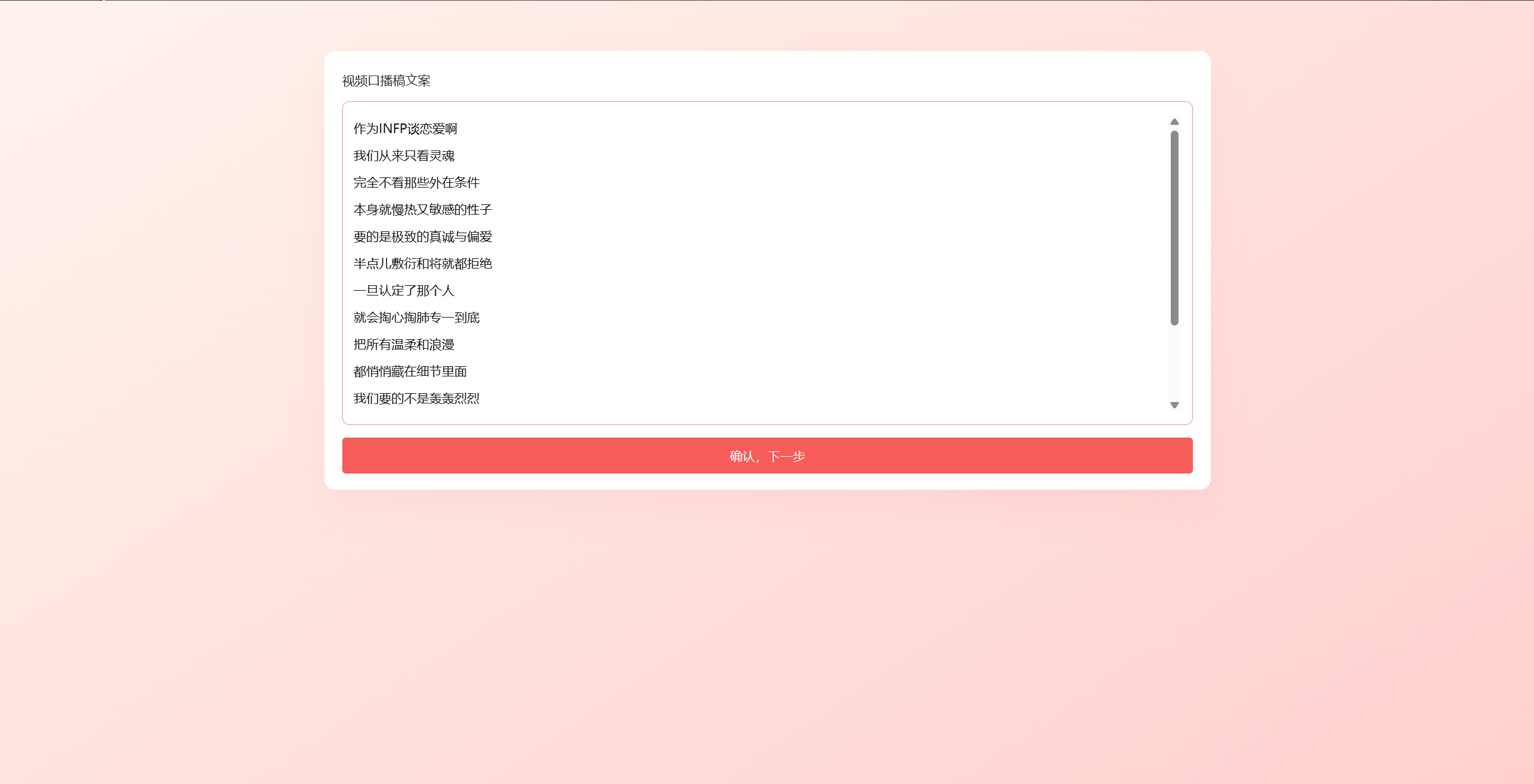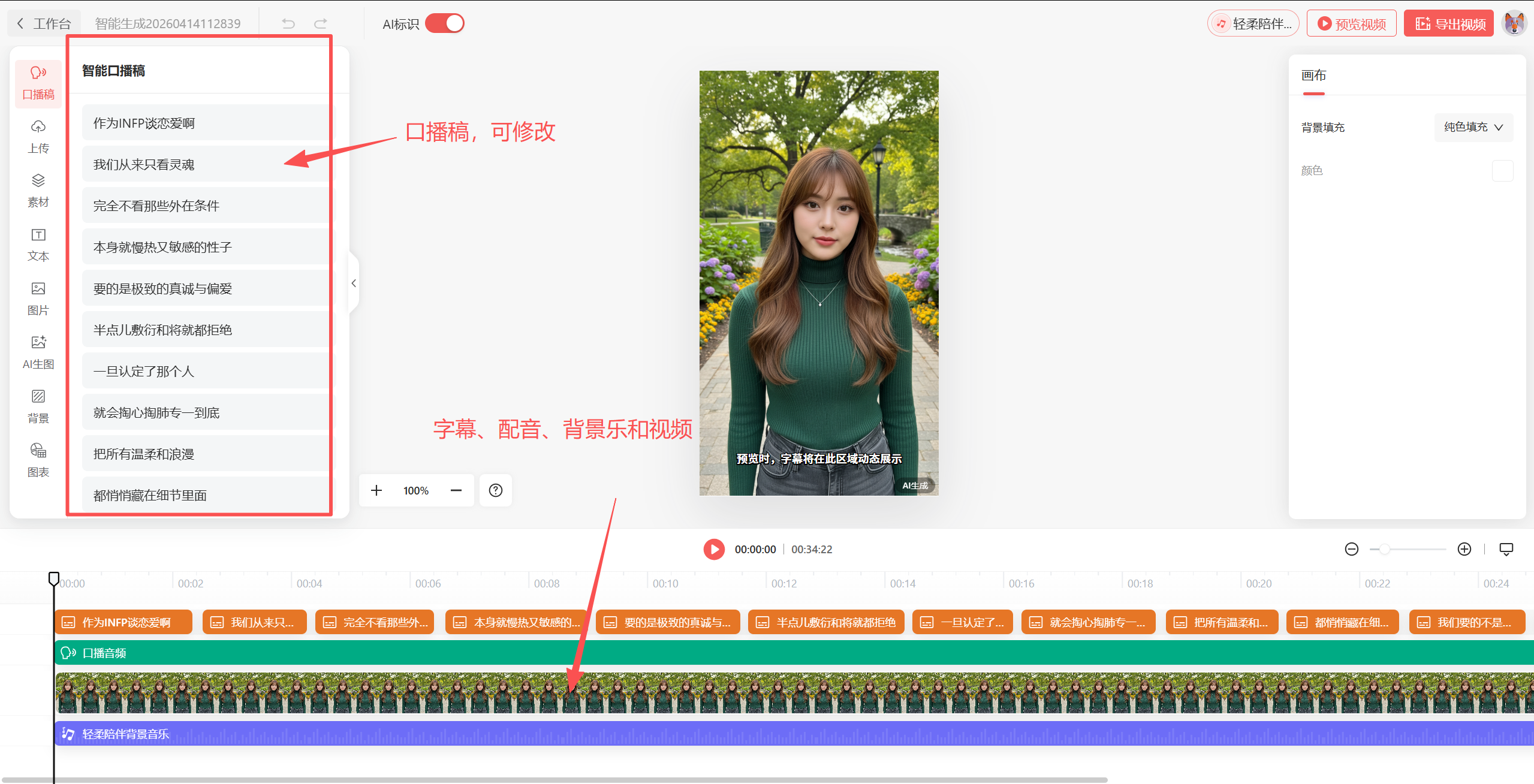 口播稿我们可以修改,甚至是全部删掉之后复制粘贴自己的文案。但是需要注意,这里的文案是和字幕对应起来的,所以注意换行,如果不换行的话就会变成一大段字一直在视频上。