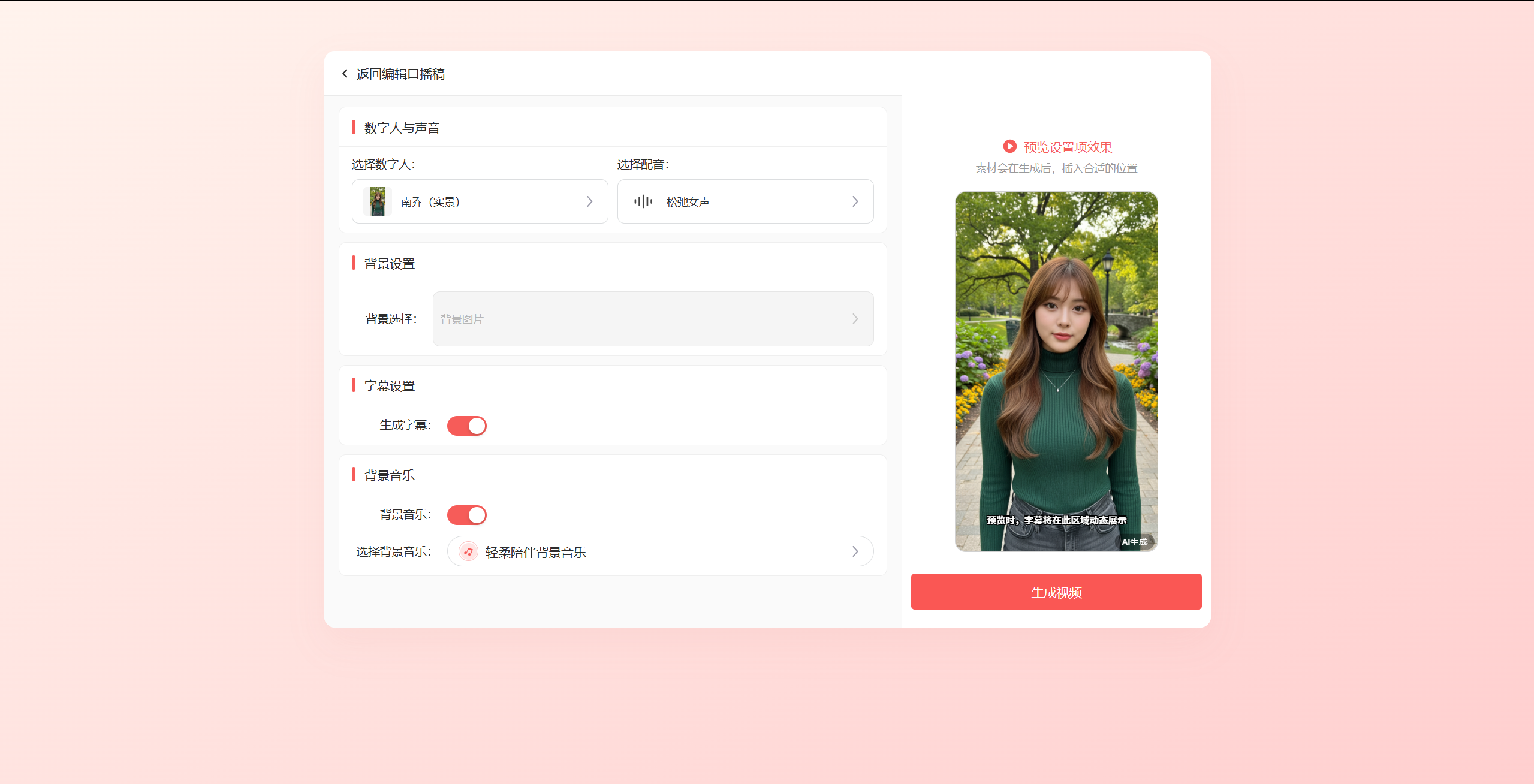 生成之后进入编辑页面,编辑页面有点像一个简易的视频编辑器。左侧是我们的口播稿,已经分成一段一段的,我们可以增加或者减少,修改后视频会自动调整。