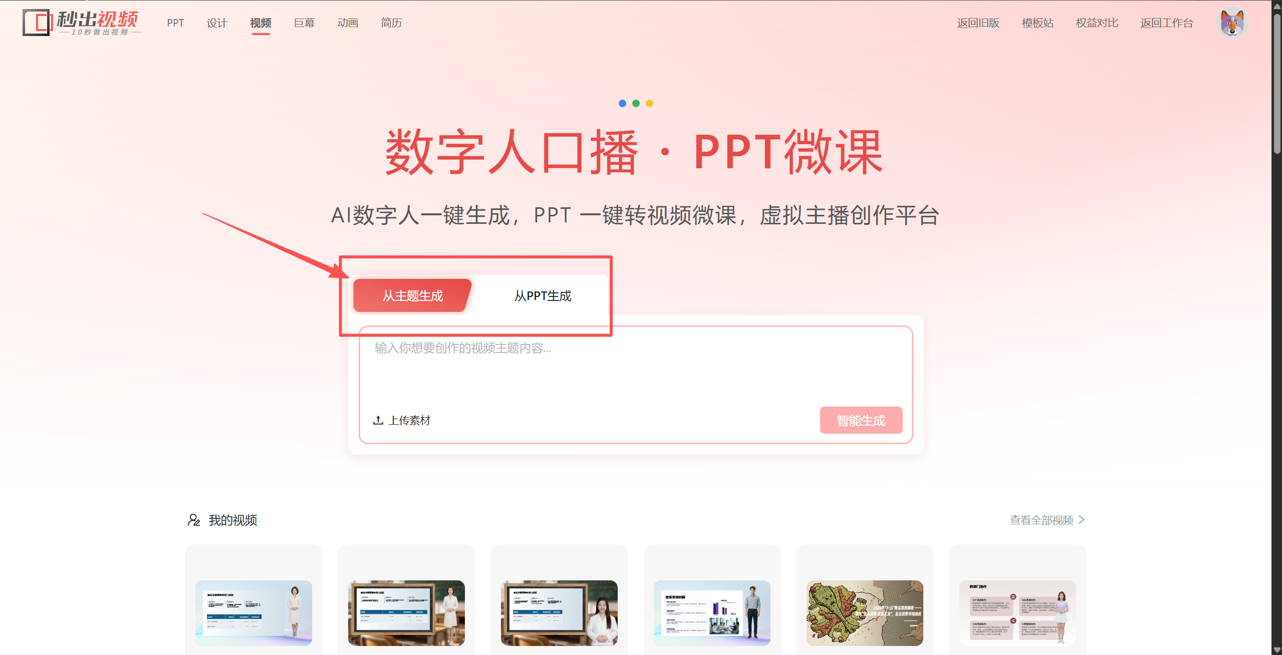 首先我们进入秒出视频官网。这里有两种模式,一种是从主题生成,一种是从PPT生成。我们要做的是纯数字人口播视频,所以我们选择从主题生成。